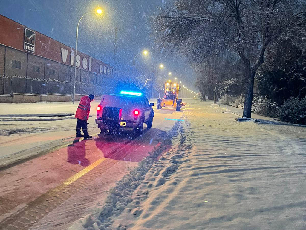 El operativo municipal en Villacañas sigue activo, tras cerrar una primera jornada de actuación que terminó sin tener que lamentar ningún incidente de consideración. Las brigadas de operarios y de voluntarios de Protección Civil trabajan desde ayer intentando despejar las vías y arterias principales de la localidad, con el esparcido de miles de kilos de sal y el trabajo de maquinaria pesada para quitar nieve en esas vías, así como labores manuales en zonas concretas, como el tramo peatonal de la calle Mayor. Como ya ocurrió ayer, además de en las arterias principales, las primeras intervenciones se están realizando en centros de primera necesidad como Centro de Salud, farmacias, mercados, etc.