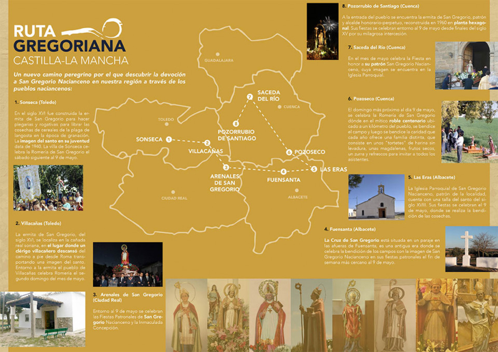 La Ruta Gregoriana de Castilla-La Mancha presenta el itinerario que conecta a los pueblos naciancenos a través de los campos de la región y cuarenta y cuatro localidades recorriendo sendas, caminos y carreteras.