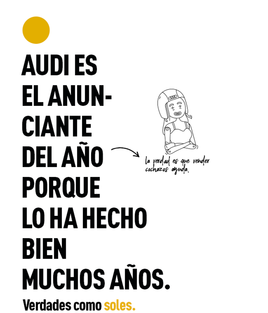 Una treintena de premios otorgados a Audi a lo largo de los últimos tres años han avalado a la compañía para convertirse en el anunciante del año de la 35 edición de El Sol. El Festival Iberoamericano de la Comunicación Publicitaria. Este galardón es muy especial, ya que reconoce la trayectoria creativa de la marca a través de los premios que han obtenido las diferentes agencias que trabajan para esta.