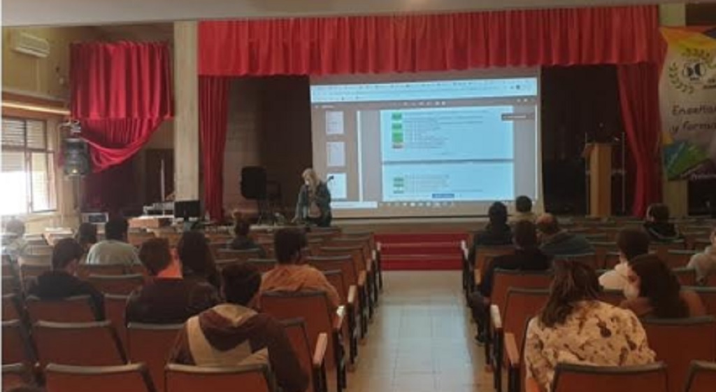En este caso y por motivos de la actual pandemia, la charla se produjo tanto de manera presencial como on line, para las clases que -por motivos de limitación de aforo- no pudieron entrar dentro del salón de actos.