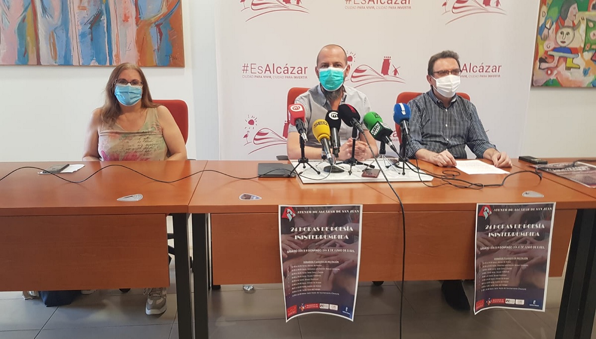 Luis Ángel Agenjo, cabeza visible del Ateneo Cultural de Alcázar de San Juan, y María José Vergara, también miembro de la entidad, han presentado junto al concejal de Cultura Mariano Cuartero la actividad de las 24 horas de poesía ininterrumpida que se celebrará el próximo fin de semana en la ciudad manchega.
