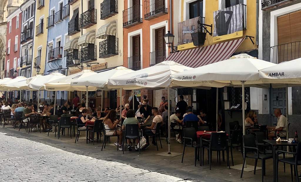 En las terrazas al aire libre se podrán ocupar la totalidad de las mesas permitidas debiendo asegurarse el mantenimiento de la debida distancia de seguridad un mínimo 1,5 metros entre las sillas de diferentes mesas.