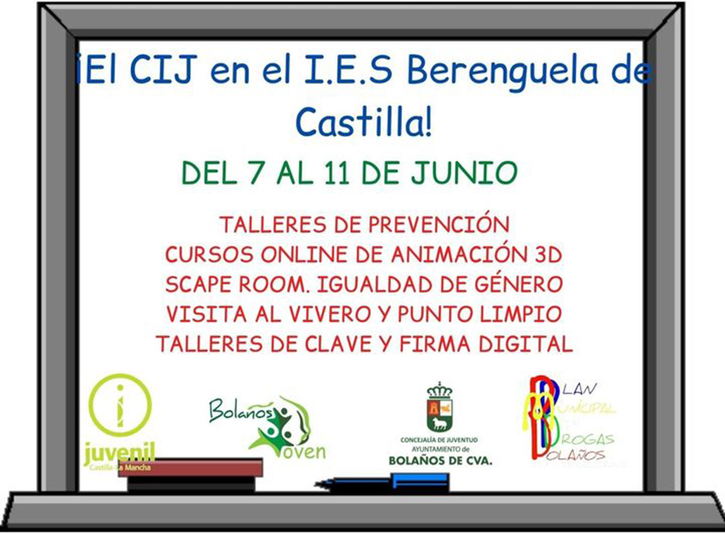 Durante esta semana, del 7 al 11 de junio, la Concejalía de Juventud del Ayuntamiento de Bolaños se traslada al I.E.S. Berenguela de Castilla para colaborar con el centro mediante una serie de actividades y talleres con motivo del final del curso escolar.