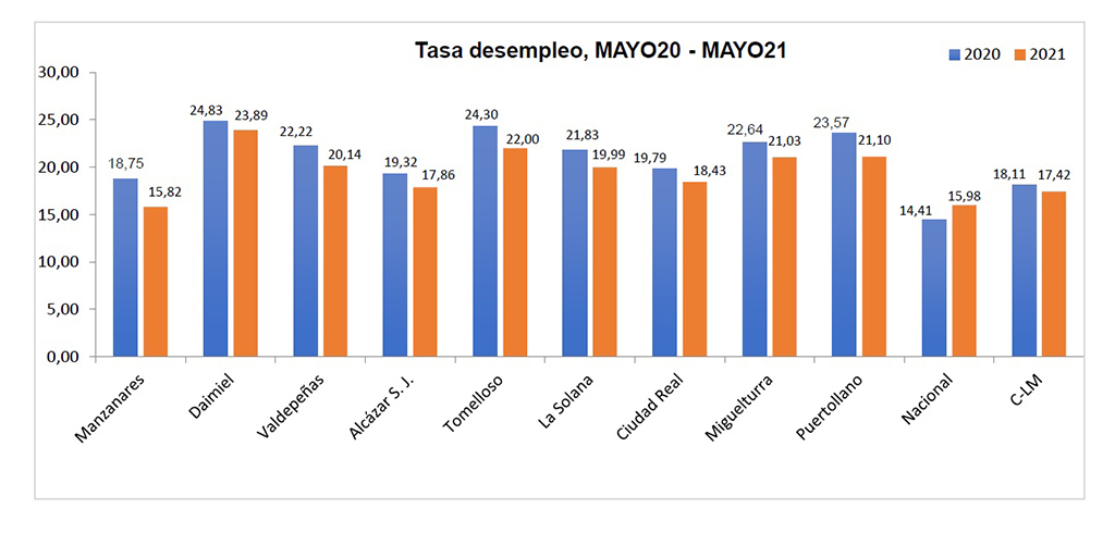 Mayo se cerró en Manzanares con 498 hombres en paro (el 33,88% del total) y 972 mujeres sin empleo (que suponen el 66,12%). En este mes, el paro masculino se redujo en 58 personas y el femenino en 47. La tasa de desempleo ha bajado este mes del 16,95 a 15,82%, por lo que por primera vez en mucho tiempo está por debajo de la tasa nacional (15,98%), y sigue por debajo de la regional (17,42%).