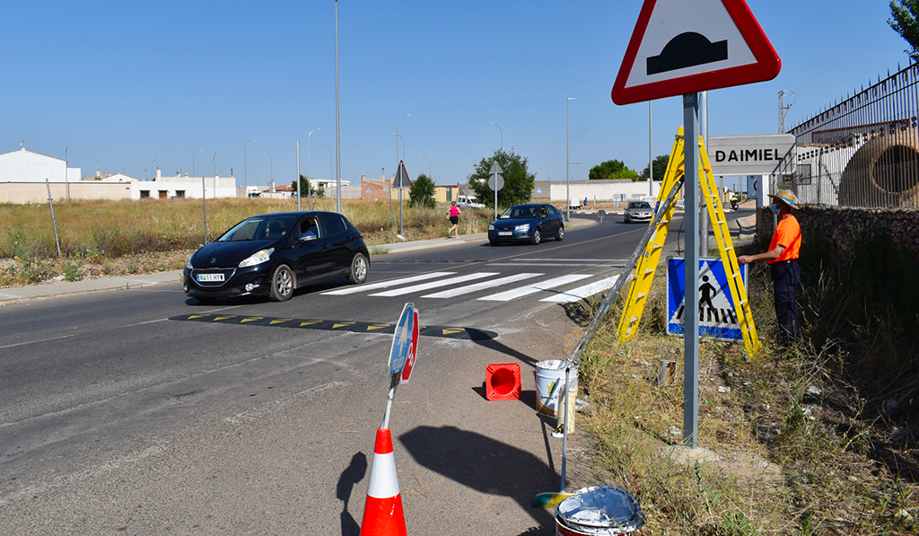 Tras el trabajo de los operarios de servicios múltiples con el pintado del cebreado y de los operarios electricistas que han colocado la señalización, el paso de cebra ha quedado completamente operativo. Además, para evitar el paso de coches a alta velocidad que vengan desde la carretera de Valdepeñas, se han colocado diferentes indicaciones para la reducción progresiva de velocidad, bandas sonoras y reductores de caucho.