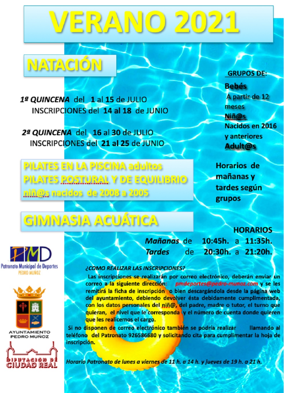 El Ayuntamiento de Pedro Muñoz, a través del Patronato Municipal de Deportes, pone en marcha su programa de cursos de natación y actividades como pilares y gimnasia acuática para este verano. Unas actividades dirigidas, por grupos, a bebés a partir de 12 meses, niños y niñas nacidos en el año 2017 y anteriores y adultos.