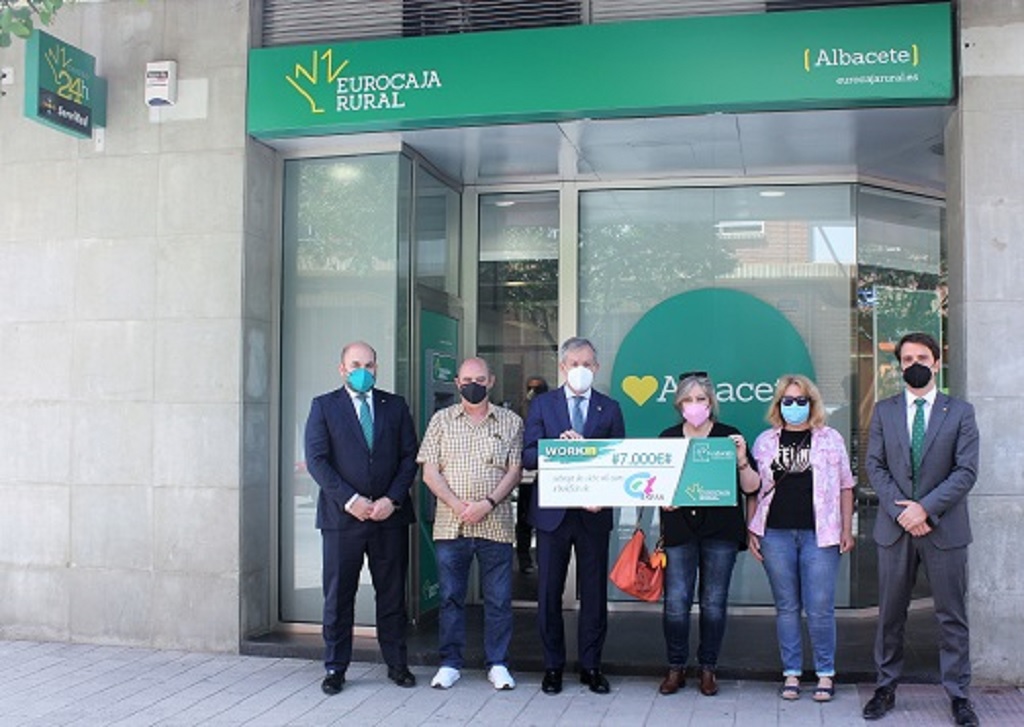 El presidente de Eurocaja Rural, Javier López Martín, acompañado del director territorial en Albacete, Carlos Prior García y del director de la Oficina de Eurocaja Rural Urbana II de Albacete, Pedro José Gómez Gómez, ha hecho entrega de este importe a la responsable de gestión de ASPAS Albacete, Encarnación Fernández, que acudió junto a algunos miembros de la asociación.