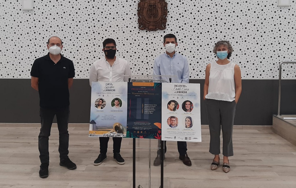 El presidente de la Filarmónica Beethoven de Campo de Criptana, Luis Jesús González Orta, el Director de la banda, Juan José Fernández Olivares y la concejala de Cultura Rosana Fernández y el alcalde de la localidad, Santiago Lázaro, han presentado este jueves una serie de cursos de formación para los componentes de la Filarmónica y un conjunto de conciertos estivales que se celebrarán este verano en el municipio manchego.