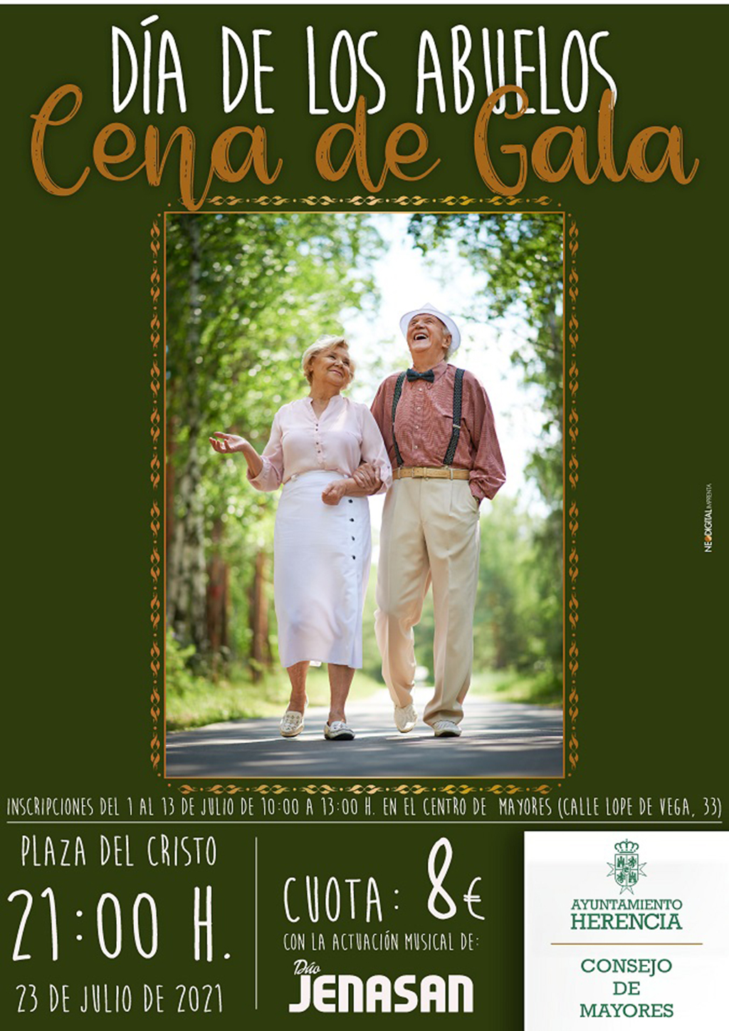 Desde el área de Bienestar Social y con la colaboración del Consejo de Mayores y la Asociación San Joaquín y Santa Ana, se está preparando un acto cargado de emotividad y sorpresas para rendir homenaje a los más veteranos que meses tan duros han pasado, y que bien merecen un respiro y una velada segura y feliz, amenizada por el dúo Jenasan.