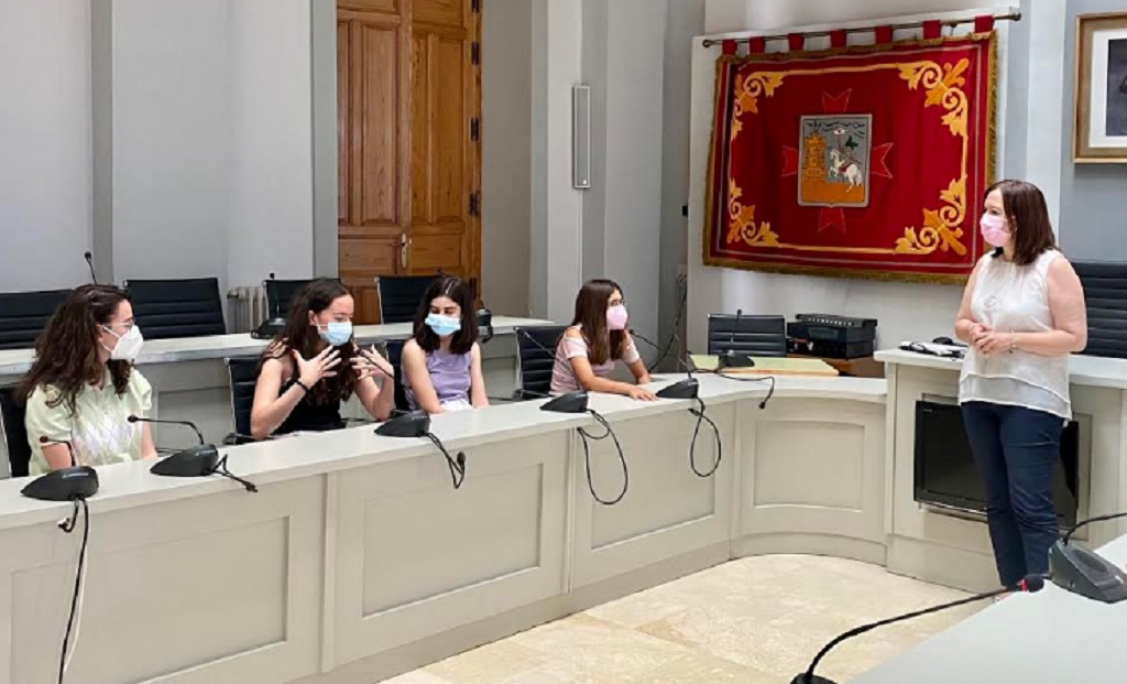 La alcaldesa de Alcázar de San Juan, Rosa Melchor, ha recibido en el Salón de Plenos a las alumnas ganadoras de la fase autonómica del concurso del Ministerio de Consumo, Consumópolis, en la categoría de primer y segundo curso de Educación Secundaria Obligatoria.