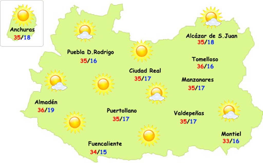 El viento soplará flojo del SW, con rachas moderadas a primera hora de la tarde. Las temperaturas registrarán suaves ascensos, con mínimas soportables, por debajo claramente de los 20ºC, y máximas en el entorno de los 35ºC en general: