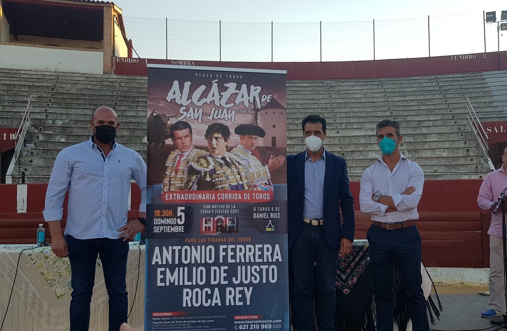 La empresa Tauroemoción ha presentado este viernes, 2 de julio, el cartel taurino de la Feria y Fiestas de Alcázar de San Juan 2021 con tres de los toreros más importantes de la temporada anunciados en él: los extremeños Antonio Ferrera y Emilio de Justo junto al peruano Andrés Roca Rey, que lidiarán toros de Daniel Ruiz. El Ayuntamiento de Alcázar de San Juan, a través de la concejalía de Asuntos Taurinos, ha estado presente en el acto junto con el Director de Organización de la empresa en la zona Este, Javier Vázquez.