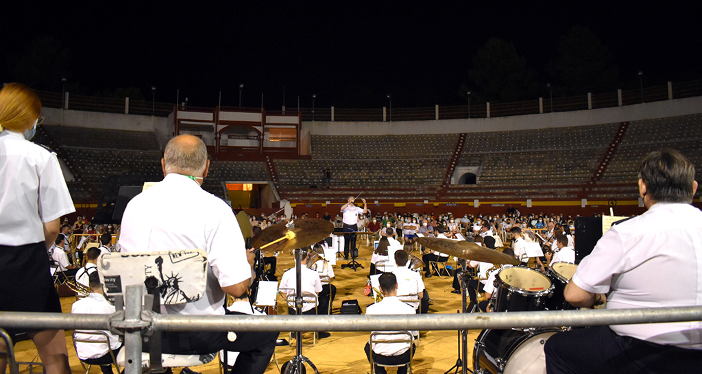 La Banda Municipal de Música ofreció el pasado viernes el primero de los cuatro conciertos de verano programados para el mes de julio. Con el aforo dispuesto para la ocasión desde la Plaza de Toros prácticamente completo, la banda ofreció un variado repertorio que comenzó con un bolero, ‘El Relog’, y acabó con una versión para banda de la canción pop ‘Viva la vida’ de Coldplay. Sobre la elección de esta canción, el director de la banda Pedro Francisco Sánchez-Valdepeñas, indicó que la intención es realizar un llamamiento a la alegría tras el desánimo de los duros meses de pandemia.