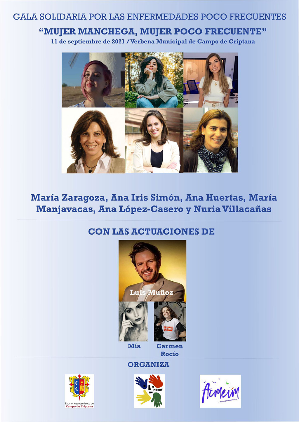 El Instituto de Investigación y Desarrollo Social de Enfermedades Poco Frecuentes anuncia que el día 11 de septiembre de 2021 se celebrará en la verbena municipal de Campo de Criptana una noche cultural solidaria a favor de las Enfermedades Poco Frecuentes. La velada consistirá en una tertulia cultural compuesta por mujeres manchegas representativas del mundo de la comunicación, la cultura y la empresa: María Zaragoza, Ana López-Casero, Ana Iris Simón, Nuria Villacañas, María Manjavacas y Ana Huertas. Este evento tendrá lugar bajo el nombre de ‘Mujer manchega, mujer poco frecuente’. Asimismo, como colofón de esta velada, los asistentes podrán disfrutar de un espectáculo musical que correrá a cargo de Luis Muñoz, así como de Mía y Carmen Rocío.