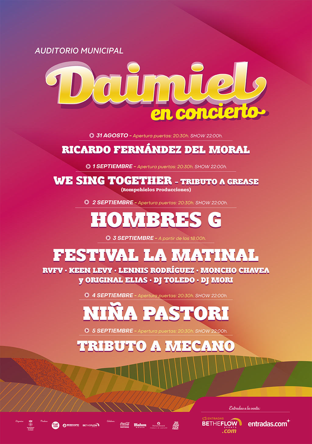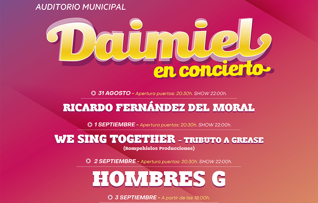 En www.daimiel.es se ha colgado un banner a través del que se accede a las plataformas habilitadas que venden las entradas de Hombres G, Niña Pastori, Festival ‘La Matinal’ y el Tributo a Mecano. En el caso de Ricardo Fernández del Moral o ‘We sing together’ de Rompehielos, las entradas pueden comprarse en los puntos de venta físicos.
