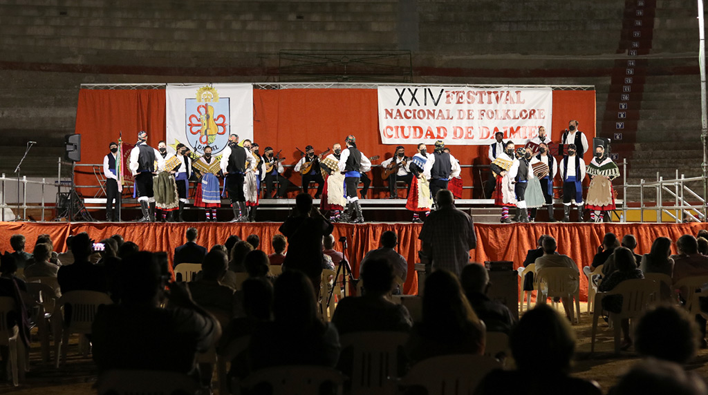 El Festival Nacional de Folklore ‘Ciudad de Daimiel’ cumplió este sábado su vigésimo cuarta edición. En su nuevo emplazamiento, la Plaza de Toros, el certamen aglutinó la música y los bailes tradicionales de grupos de Villarrobledo, Madridejos y Daimiel, llenando prácticamente todas las localidades disponibles. Seguidillas, rondeñas, jotas y fandangos sonaron durante más de una hora y media en una velada que se cerró con varias parejas de los tres grupos participantes bailando de manera conjunta la Jota de Ballesteros, una de las piezas aprendidas en las Jornadas de Folklore que anualmente disfrutan estos grupos y en la que se mezclaron estilos e indumentaria.
