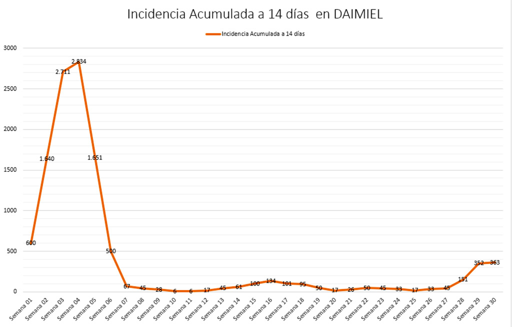 Daimiel ha notificado 26 nuevos positivos en la semana del 26 de julio al 1 de agosto. Se trata de la primera vez que la cifra semanal disminuye desde la semana 27 (del 5 al 11 de julio), momento en el que la tendencia se convirtió en ascendente. No obstante, la incidencia acumulada a 14 días sí que continúa subiendo ya que, en esta última serie de datos ofrecidos por la Consejería de Sanidad, se han actualizado los correspondientes a la semana anterior (la del 19 al 25 de julio). El jueves pasado el registro fue de 36 nuevos positivos, pero se llegó al domingo con 39. Con todo esto, Daimiel se sitúa con una incidencia acumulada a 14 días de 363 casos por cada 100.000 habitantes, manteniéndose en ese riesgo extremo de transmisión del virus, y once puntos más que la semana pasada.