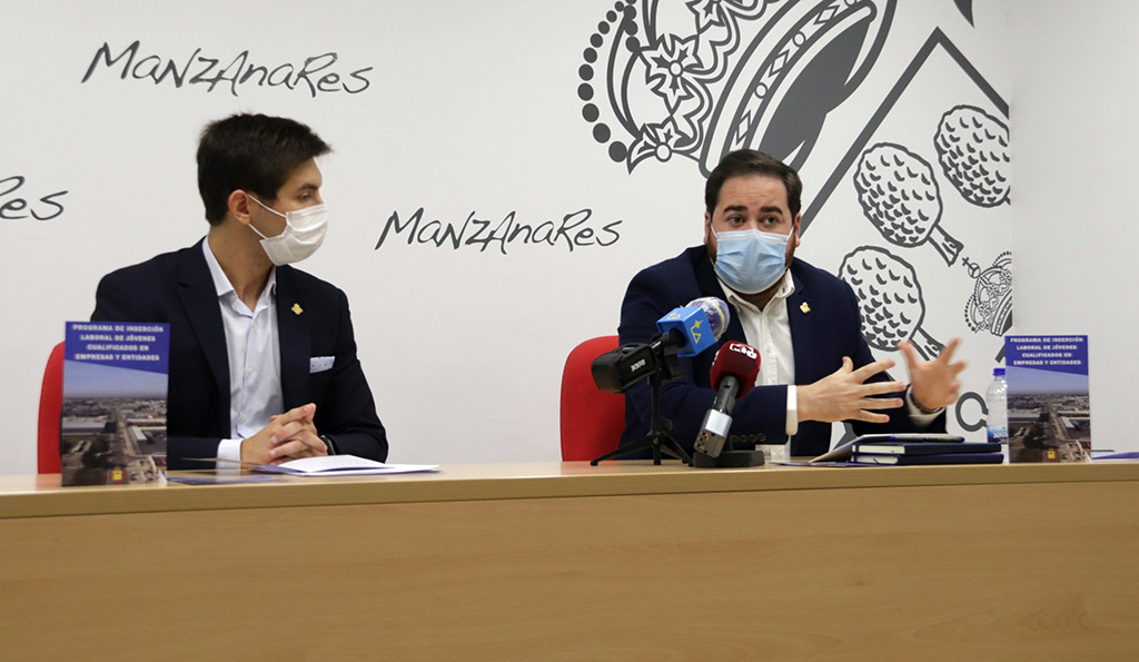 Pablo Camacho y Manuel José Palacios han presentado en la mañana de este miércoles el nuevo programa de inserción laboral de jóvenes cualificados en empresas y entidades puesto en marcha por el Ayuntamiento. Gracias a esta iniciativa, veinticinco personas de Manzanares menores de 35 años con titulación pero sin experiencia disfrutarán de su primera oportunidad laboral, mientras que las empresas y entidades de la localidad participantes verán complementado su nivel de sus recursos humanos y recibirán una ayuda económica directa.