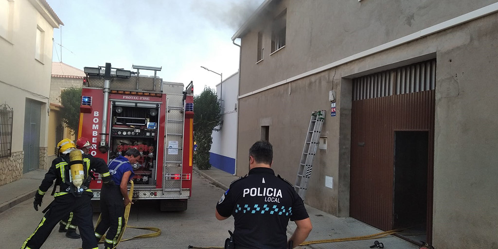 Dos unidades de bomberos, Policía Local y Guardia Civil trabajan en el operativo para sofocar el incendio en un almacén industrial ubicada en la calle Tres Carabelas de Campo de Criptana.