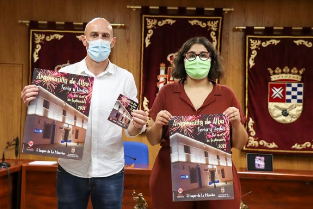 El alcalde de Argamasilla de Alba, Pedro Ángel Jiménez y la concejala de festejos, Alba Hilario han presentado en la mañana del miércoles 25 de agosto la programación de la Feria y Fiestas 2021 en honor a la patrona de la localidad, que se desarrollará del 4 al 9 de septiembre.