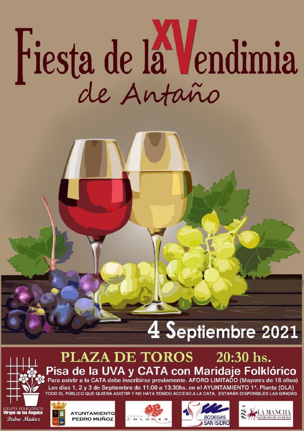 Como es habitual, se realizará la ofrenda de los primeros racimos del año y posteriormente y a las 20:30 h en la Plaza de Toros de la localidad, tendrá lugar la XV Fiesta de la Vendimia, con la pisa de la uva, la realización del grado, nombramiento al Vendimiador de Honor y posteriormente tendrá lugar una Cata con Maridaje Folkórico, en la que se podrán degustar vinos de Pedro Muñoz a los que se asociará un baile del repertorio del grupo.