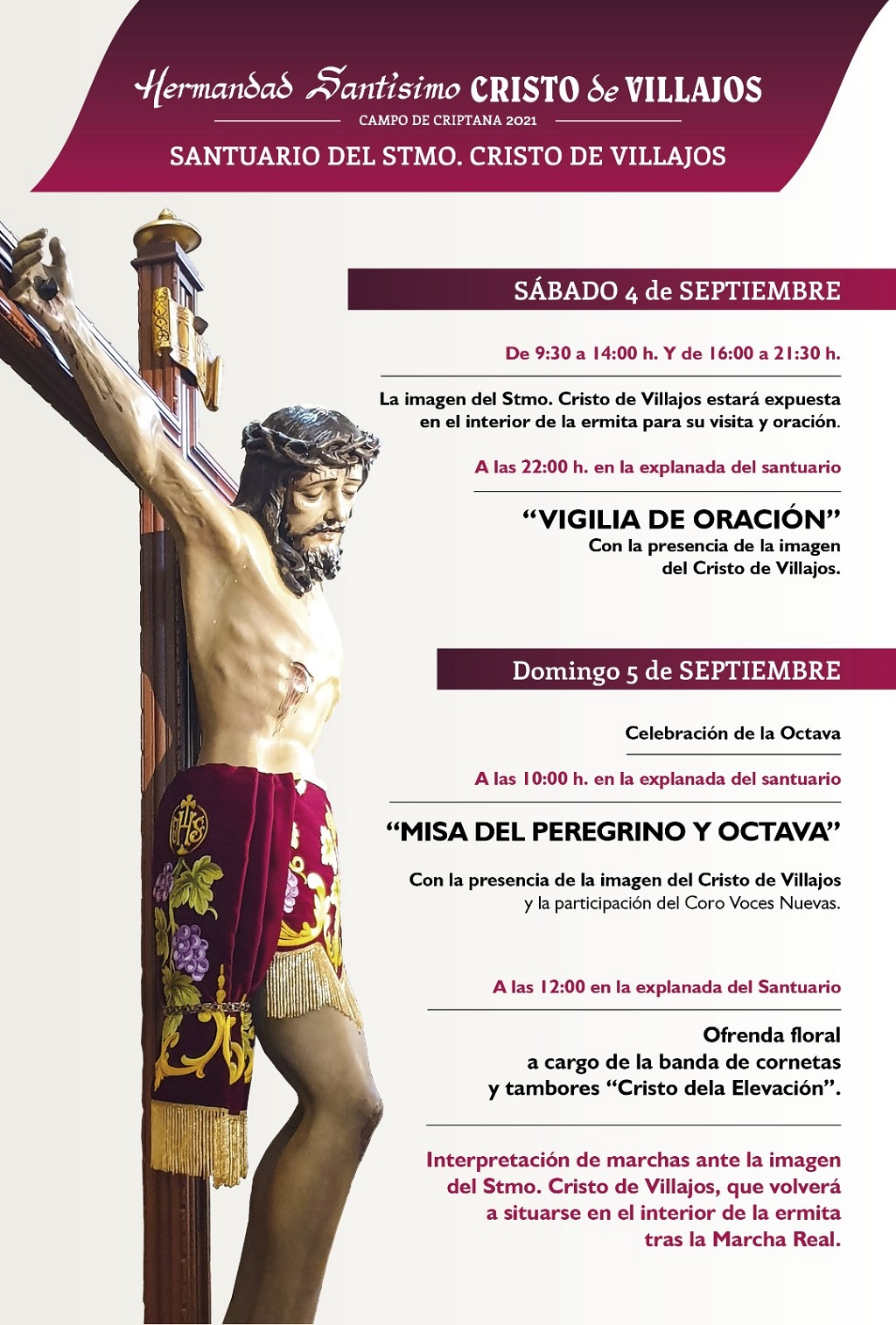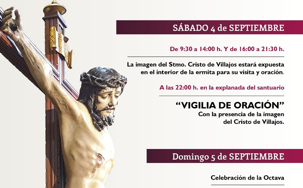 El sábado, 4 de septiembre, la imagen del Cristo estará expuesta en el interior de su ermita para visitarla y orar. A las 22:00 horas, en la explanada del santuario, habrá una vigilia de oración.