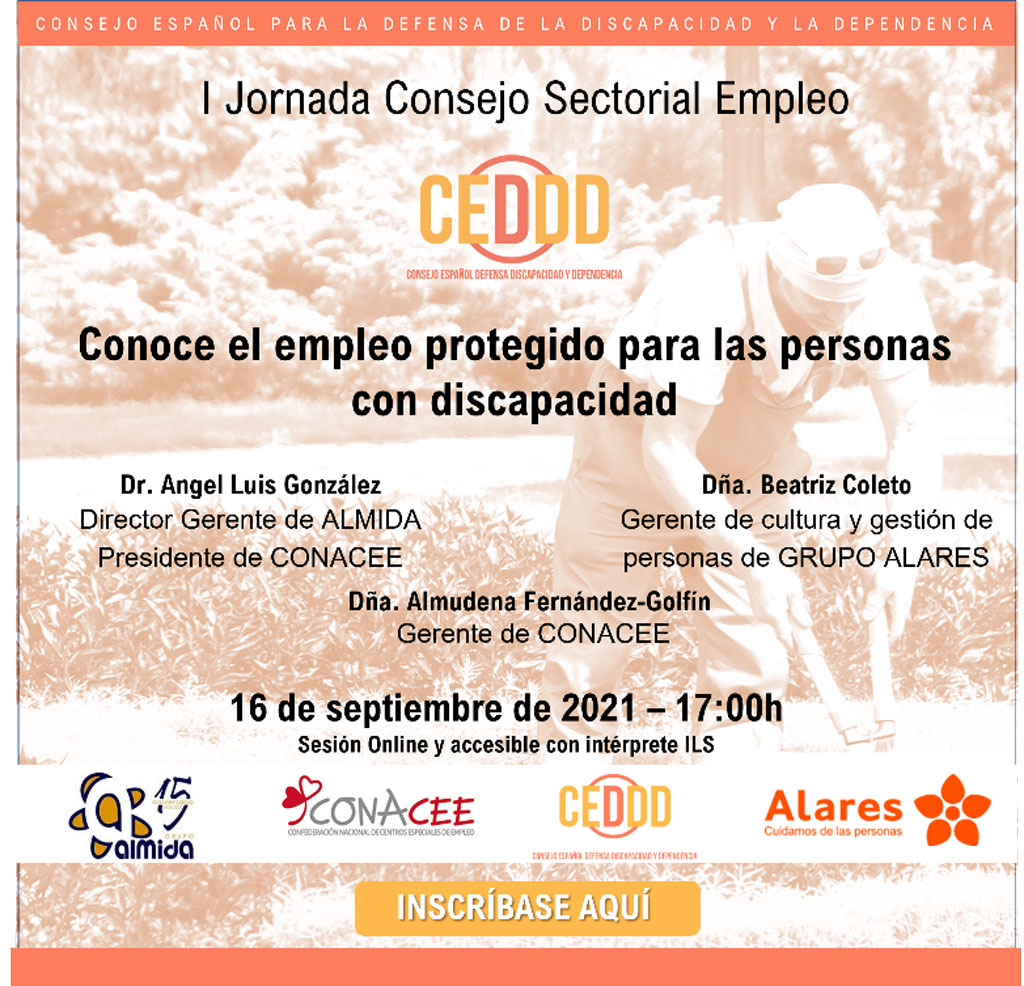 El Consejo Español para la Defensa de la Discapacidad y la Dependencia (CEDDD) organiza la I Jornada del Consejo Sectorial de Empleo. Los ponentes serán D. Ángel Luis González, director gerente de ALMIDA y presidente de CONACEE; Dña. Beatriz Coleto, gerente de cultura y gestión de personas en Grupo ALARES y Dña. Almudena Fernández-Golfín, gerente de CONACEE.
