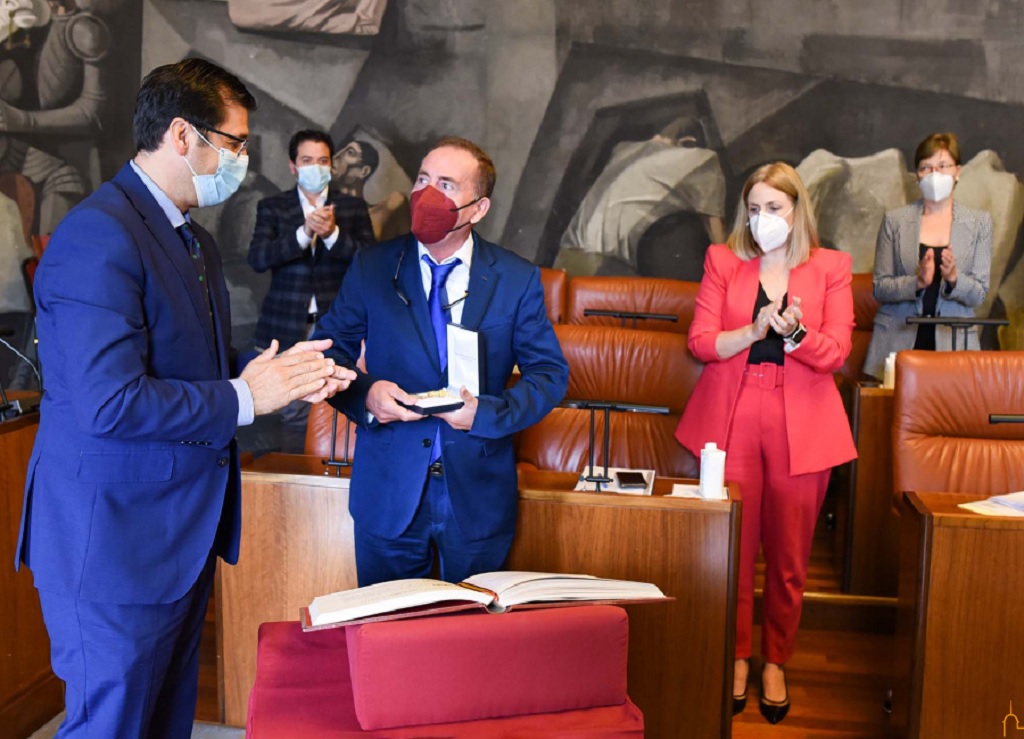 Ha sustituido a la alcaldesa de Torre de Juan Abad, María del Señor Fresneda, como miembro de la Corporación provincial el alcalde de Almedina, José Antonio Talavera Sánchez, quien hoy ha prometido el cargo de diputado provincial y ha quedado adscrito al grupo socialista, tras ser emitida la preceptiva credencial por parte de la Junta Electoral Central. Talavera ha recibido la medalla de la Diputación de Ciudad Real de manos de Caballero. El Pleno, con aplausos y en pie, le ha dado la bienvenida a la institución provincial. Talavera ha sido nombrado presidente del Consorcio de Residuos Sólidos Urbanos (RSU).