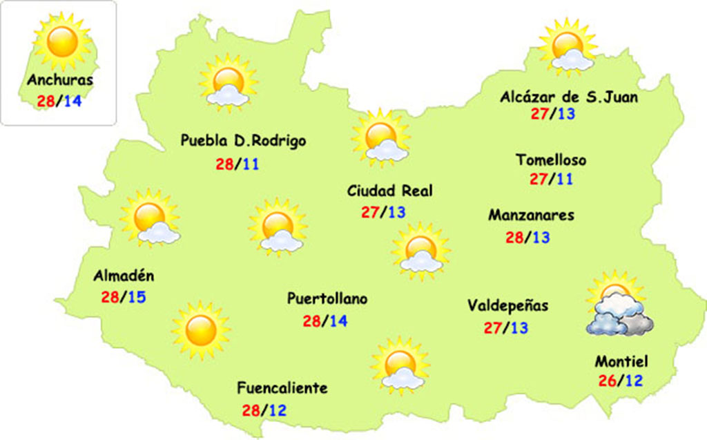 El viento soplará flojo variable en horas centrales del día y del NE a primeras y últimas horas. Las temperaturas se mantendrán sin variaciones, con mínimas de 11ºC-13ºC en muchos puntos y máximas que alcanzarán los 27ºC-28ºC (localmente algún grado más) en la mayoría de nuestros municipios: