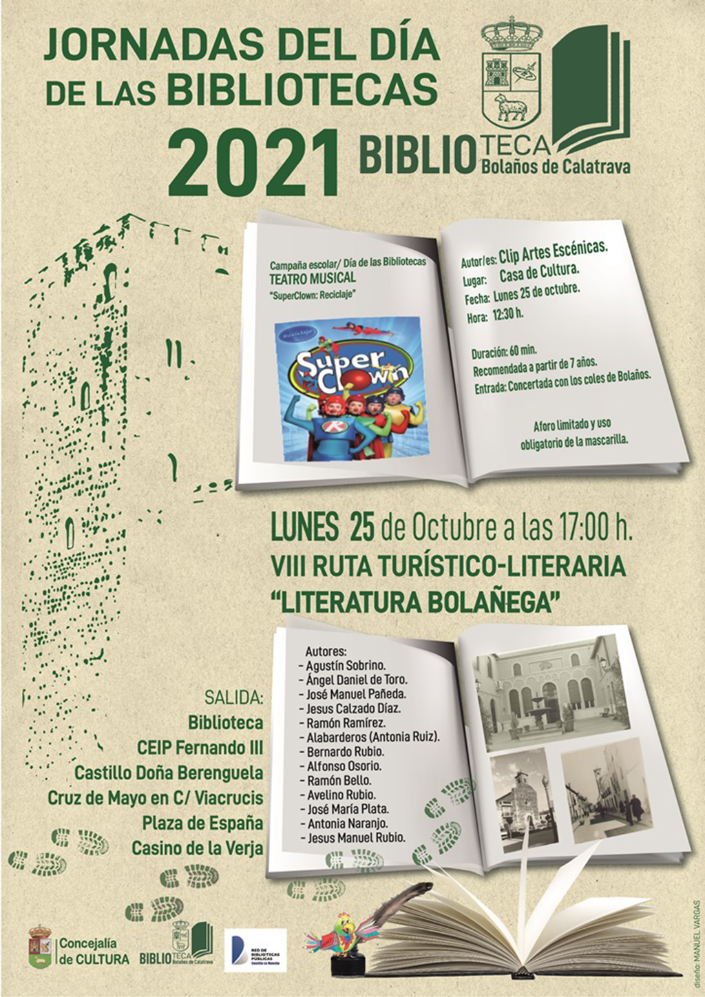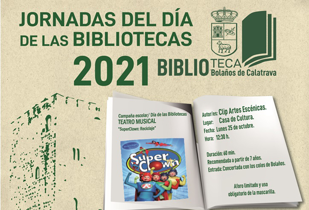 El lunes 25 de octubre, por la mañana, la Biblioteca recibirá la visita del alumnado de 5º y 6º de Primaria de todos los CEIP de Bolaños. Este año participarán en un musical de sensibilización escolar titulada “Super Clown” para concienciar a los alumnos sobre la importancia del reciclaje en la vida diaria.