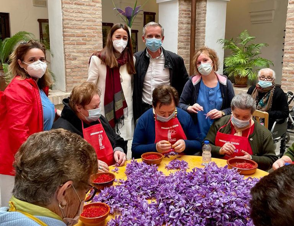 La diputada de Juventud, Laboratorio y Promoción de la Salud visitó junto al alcalde el Museo del Azafrán donde mujeres de la localidad procedían a la monda de la flor.