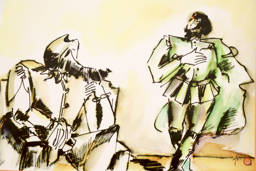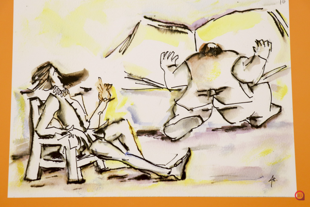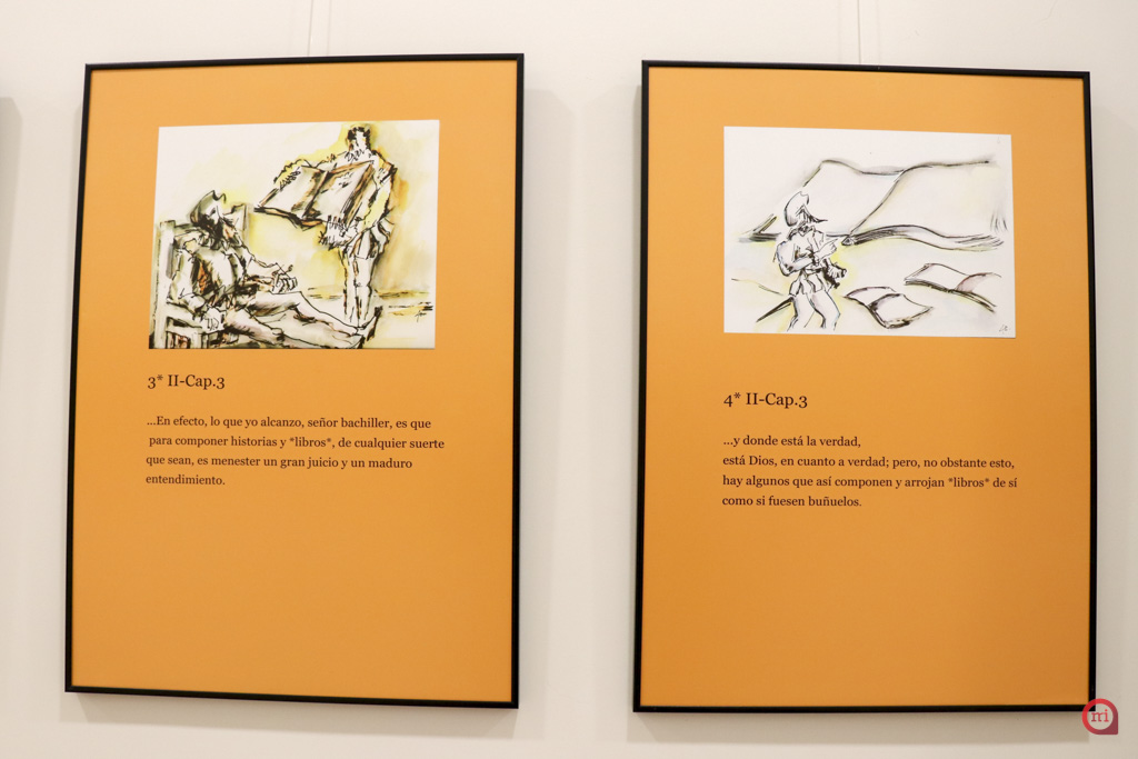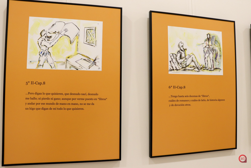 La elaboración de la exposición por parte de Escribano tiene su base en el fomento y animación a la lectura en estos tiempos en los que estamos invadidos por imágenes que nos llegan desde diferentes plataformas. Para ello Escribano pensó en realizar una exposición en torno a Alonso Quijano, apasionado lector, “Alonso Quijano transformado en Don Quijote, según nos cuenta su autor, no tuvo problemas de “animación a la lectura”, por ello, visualicé la figura de este héroe literario reivindicando su desmedido amor por los libros”. El trabajo de Escribano muestra mediante ilustraciones a Don Quijote leyendo y circulando por su novela, en dialogo con sus compañeros, aquellas secuencias de la obra en las que aparece la palabra “Libros”. Hasta en un total de 30 ocasiones aparece la palabra libros en la segunda parte de “El Quijote”, por lo que Escribano dibujó, corrigió y compuso en torno a lo que el texto le iba describiendo en cada una de estas ocasiones.
