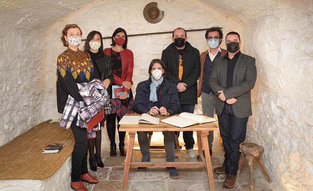 Previamente al encuentro, Benjamín Prado fue invitado por el concejal a firmar en el libro de visitas ilustres de la Casa de Medrano, para ello, el escritor, junto al concejal y varios integrantes de Aldaba, bajaron a la cueva de Medrano, conocida como la prisión de Cervantes donde engendró el Quijote, para que dejase su impronta en el libro, en esta ocasión, en forma de autorretrato, “os he dejado a mí mismo”, subrayó.