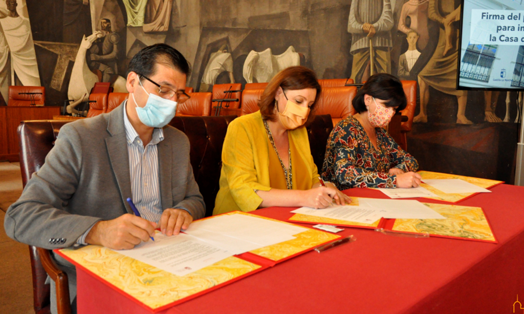 El presidente de la Diputación, la alcaldesa de Torre Juan de Abad, y la consejera de Empleo, Empresas y Empleo, han firmado esta mañana un protocolo general de actuación para impulsar la remodelación de la Casa de Don Fernando Frías López