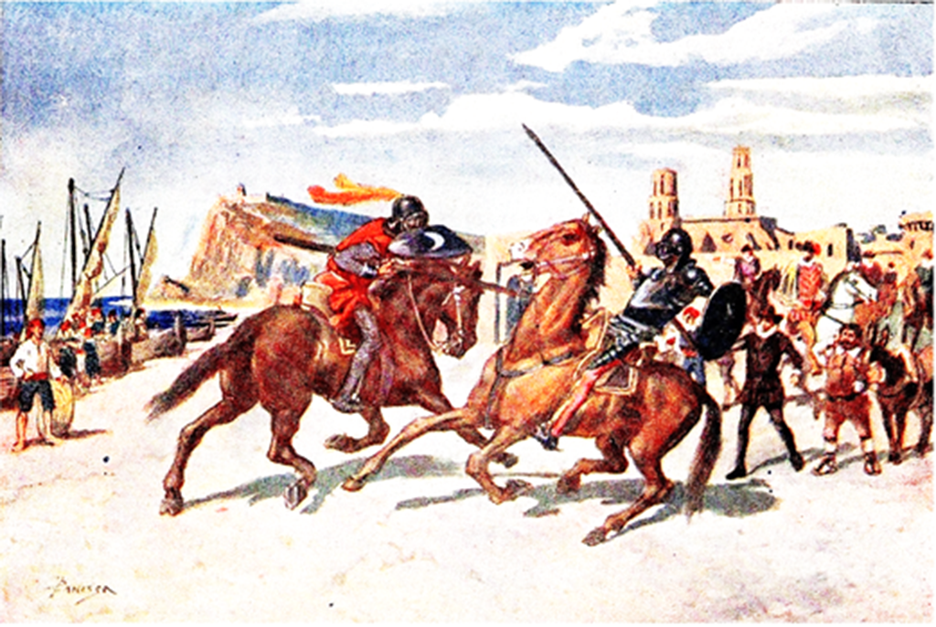 La propuesta era colocar una estatua en la playa de la Barceloneta, donde aconteció «la aventura que más pesadumbre dio a don Quijote de cuantas hasta entonces le habían sucedido»: su derrota frente al Caballero de la Blanca Luna. No se me ocurre un lugar mejor. Ahora bien, desconozco el diseño de la estatua propuesta. ¿Otro busto? ¿Una de cuerpo entero? ¡Qué poca originalidad! Nada mejor que dos caballeros abalanzándose uno contra el otro, lanza en mano, como en la ilustración aportada por Jaume Pahissa para la lujosa edición de Miquel Seguí de 1897. Que yo recuerde, no hay nada así en el mundo.