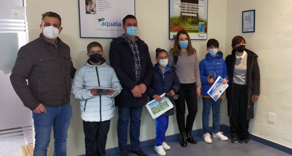 Jaime Martínez Jiménez, alcalde de Villacañas, y Mª Carmen Viñas Rivas, jefa de servicio de Aqualia en Villacañas, han entregado tres diplomas y tres smartwatch, uno para cada finalista, en las oficinas de Aqualia. Los premiados han sido David Andrei Pacheco Vasiu y Violeta Úbeda Nogera del Colegio Nuestra Señora de la Consolación, que han estado acompañados por Roberto Millás, Director del colegio; y Hugo Reyes Lillo, del CEIP Santa Bárbara, que estuvo acompañado por Cecilia Espada, Jefa de Estudios del centro.