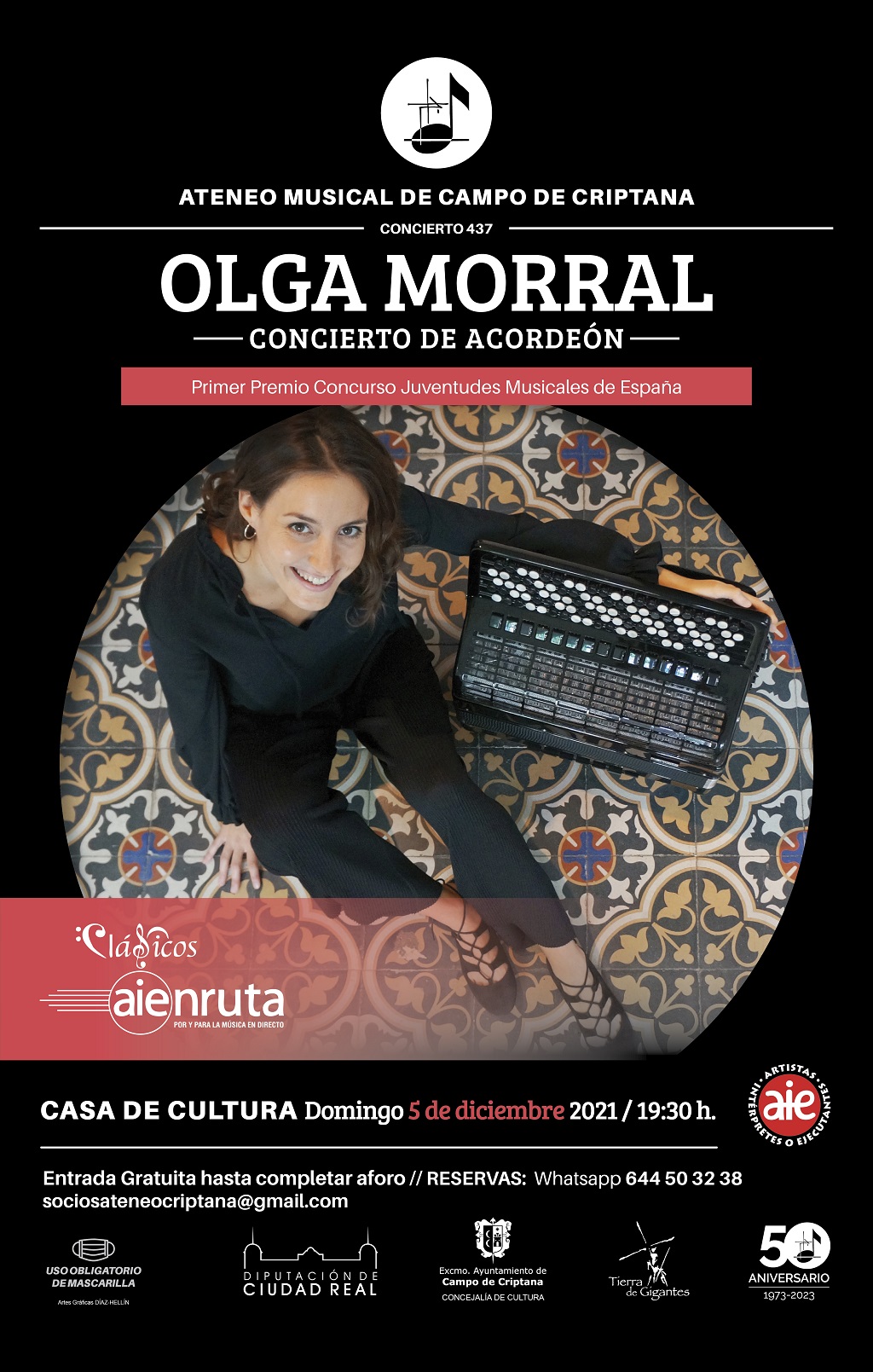 El Ateneo Musical de Campo de Criptana acogerá su concierto número 437, protagonizado por la artista Olga Morral, que ofrecerá un concierto de acordeón. Morral es el primer premio del Concurso de Juventudes Musicales de España.