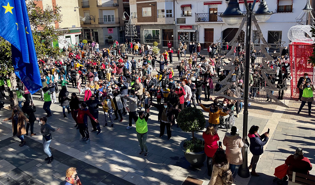 La Plaza de España ha acogido a niños, niñas y jóvenes de los distintos centros educativos de la localidad y han bailado en el “flashmob” organizado por la Asociación Padisbol en colaboración con el Ayuntamiento de Bolaños para conmemorar el Día Internacional de la Discapacidad, que se celebra este 3 de diciembre.