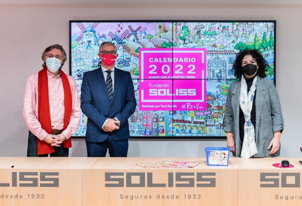 Tras la excepcional acogida del calendario Soliss 2021 con ilustraciones que retrataban motivos de los espacios más emblemáticos de nuestra tierra, el director comercial de Soliss, José Javier Del Cerro, el ilustrador Toni Reollo y María Moreno Ramos representando a la Fundación Aladina, han presentado el calendario Soliss 2022.