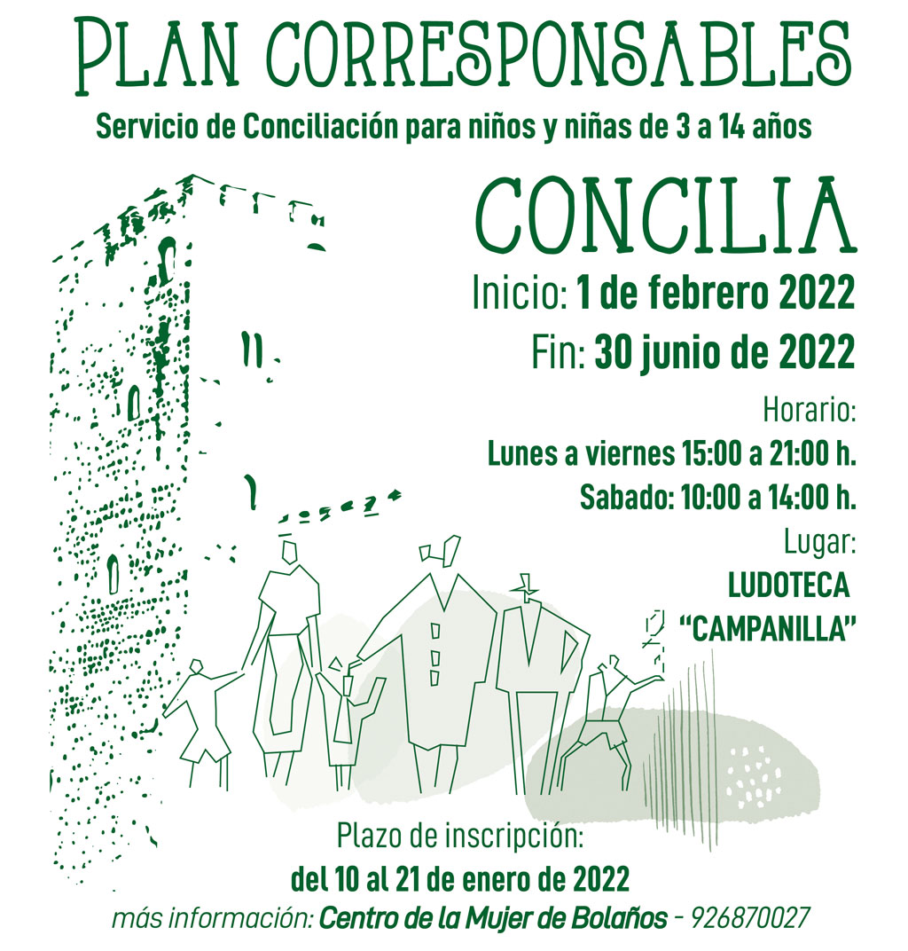 El Ayuntamiento de Bolaños lanza una nueva edición del Programa Corresponsables para ofrecer un servicio gratuito de conciliación, desde el 1 de febrero al 30 de junio, del que se puedan beneficiar las familias en las que ambos progenitores estén trabajando y tengan tengan dificultades para conciliar su vida familiar y laboral con el cuidado de sus hijos e hijas de 3 a 14 años. El periodo de inscripción será del 10 al 21 de enero de 2022.