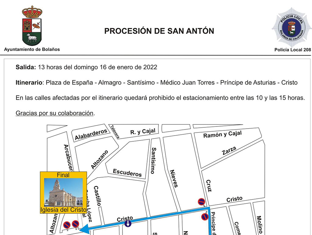 Las hogueras en honor al Santo son solo una de las citas programados este fin de semana para celebrar su festividad, ya que la Hermandad de San Antonio Abad celebrará los actos de vísperas, el sábado 15 a las 17:30 horas, y la función religiosa y posterior procesión del patrón de los animales, el domingo 16 a las 12:30 horas. El itinerario comenzará en la Plaza de España, siguiendo por las calles Almagro, Santísimo, Médico Juan Torres, Príncipe de Asturias, Cristo y acabando en la Ermita del Cristo. La Policía recuerda que está prohibido el estacionamiento en estas calles entre las 10:00 y las 15:00 horas de dicho día.