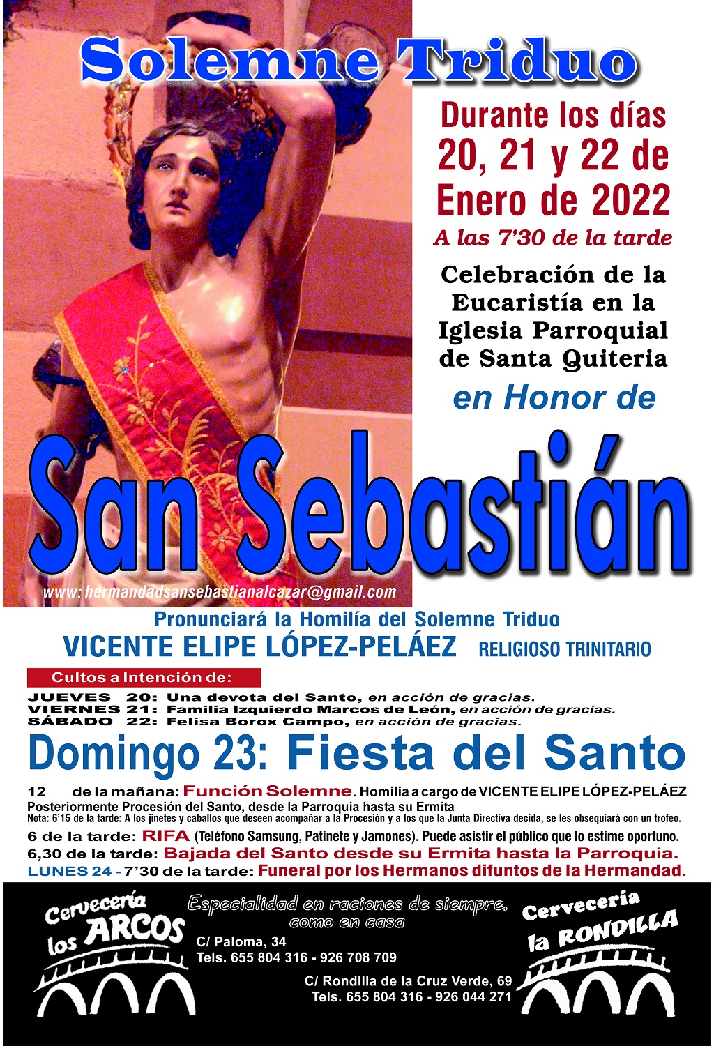 La Hermandad de San Sebastián de Alcázar de San Juan ya tiene listo el elenco de actividades religiosas para celebrar a su patrón durante los días 20, 21, 22 y 23 de enero. En los días previos a su fiesta, tendrá lugar un triduo en su honor predicado por Vicente Elipe López-Peláez, religioso trinitario, en la iglesia parroquial de Santa Quiteria.