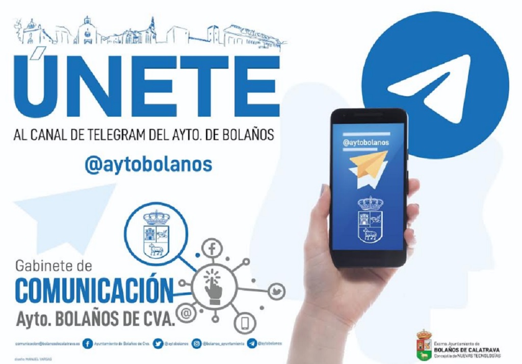Este canal informativo con el nombre ‘Ayuntamiento Bolaños de Cva.’ (@aytobolanos), se suma a los perfiles de Facebook, Twitter e Instagram en la modernización comunicativa y tecnológica del Consistorio. Para formar parte de él, solamente se requiere descargar- si el usuario no la tiene instalada aún- la aplicación gratuita ‘Telegram’, y una vez activada, unirse al canal (https://t.me/joinchat/DgOl7SVF_GlhYzlk).
