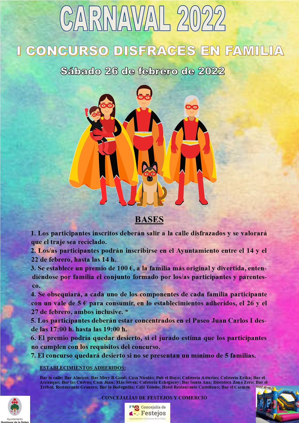 Se establece un premio de 100 euros a la familia más original y divertida, entendiéndose por familia el conjunto formado por las personas participantes y parentesco. Además a cada componentes de las familias participantes se les obsequiará con un vale de 5€ para consumir entre el 26 y el 27 de febrero en los establecimientos para consumir entre el 25 y el 27 de febrero en los establecimientos adheridos que son los siguientes: La Calle, Almirez, Mery B Good, Casa Nicolás, El Hoyo, Asturias, Erika, El Arranque, Las Cuevas, Casa Juan, Más Seven, Echegaray, Santa Ana, Zona Zero, El Trébol, Granero, La Bodeguilla, Café Toledo, Castellano.