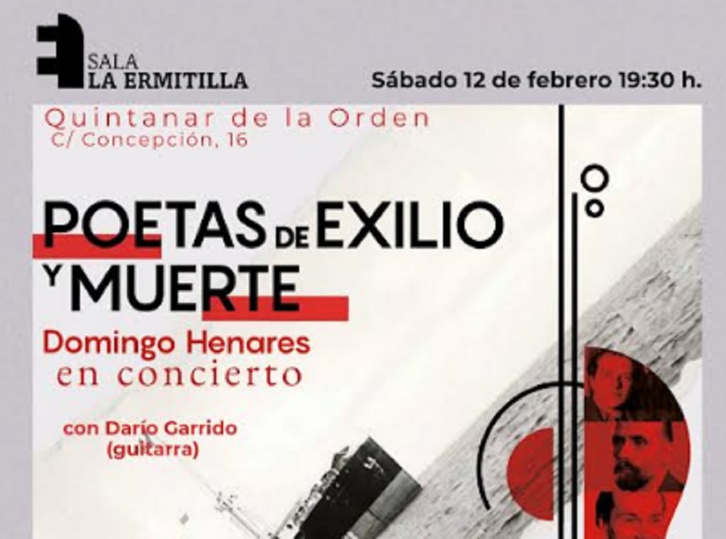 El próximo sábado, 12 de febrero a las 19.30 horas, la Sala La Ermitilla abrirá sus puertas para acoger el concierto “Poetas de Exilio y Muerte” del cantautor Domingo Henares. Un concierto programado desde la Concejalía de Cultura en colaboración con la Asociación Cultural Música Quintanar para retomar el ciclo de actuaciones y eventos culturales en esta Sala emblemática quintanareña.