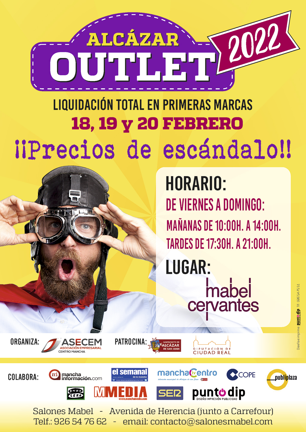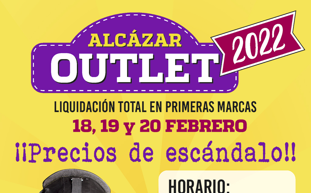 El próximo viernes 18 de febrero vuelve, tras un año de parón ALCÁZAR OUTLET, feria de liquidación del pequeño comercio de Alcázar, con 15 expositores, calzado, niños, novias y novios, fiesta, hombre y mujer, complementos y deportes y un sinfín de productos de la mejor calidad a precios de saldo.