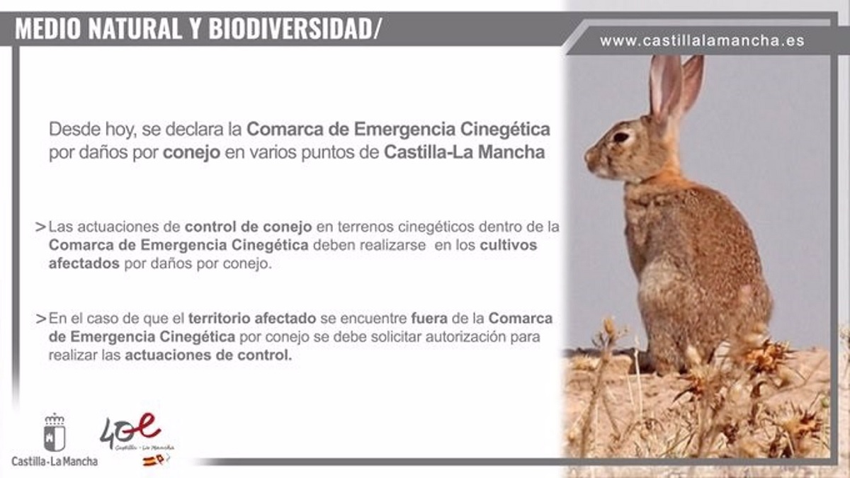 Además, el responsable de Medio Natural y Biodiversidad ha recordado que, aunque no es necesario pedir autorización en estas zonas mientras se mantenga activa esta declaración de Comarca de Emergencia Cinegética, sí que es obligatorio comunicar a la Administración pública la actuación y zona donde se van a controlar los conejos y que está permitida exclusivamente bajo los métodos de captura y periodos contemplados en la resolución.
