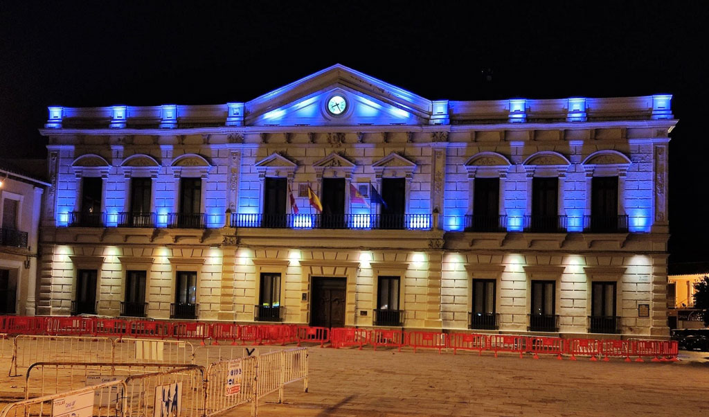 La fachada del Ayuntamiento de Alcázar de San Juan se iluminó en la noche de este viernes con los colores de la bandera de Ucrania, amarillo y azul, en solidaridad con el pueblo ucraniano ante la agresión de la Federación Rusa a este país.