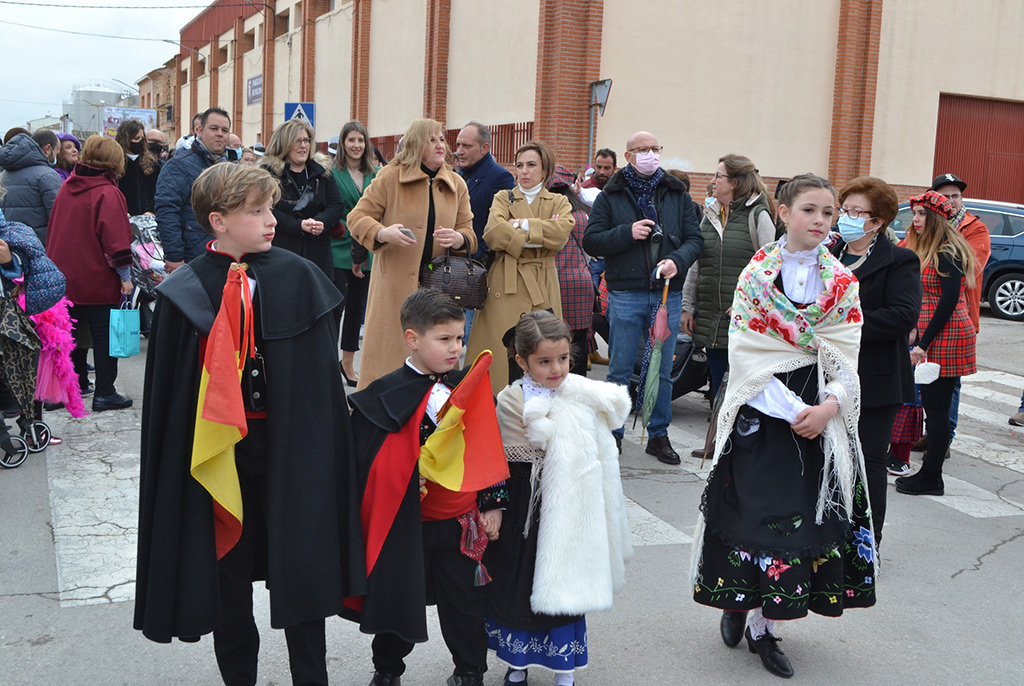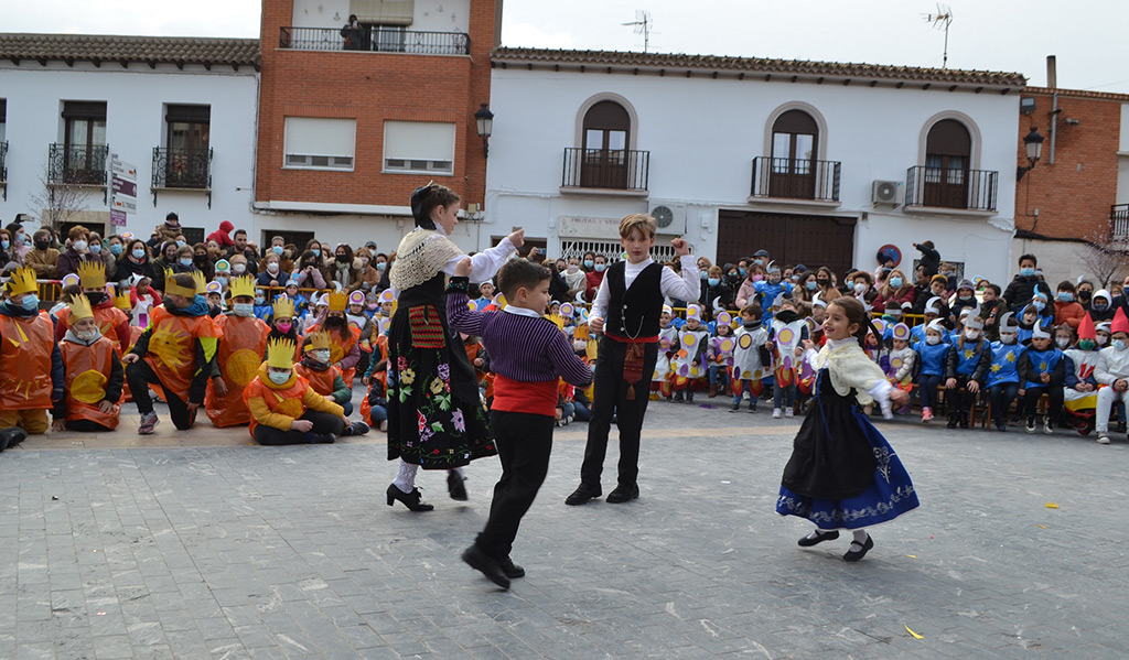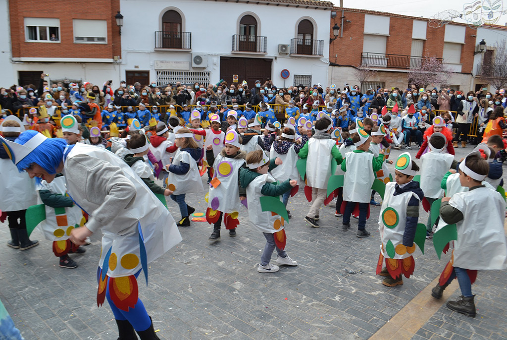 Acompañados por Gigantes y Cabezudos, los niños de Educación Infantil y Primaria recorrieron las calles de la localidad llenándolas de color y exhibiendo originales disfraces realizados con materiales reciclados, al compás de la música de la charanga ‘Si Dios quiere’.