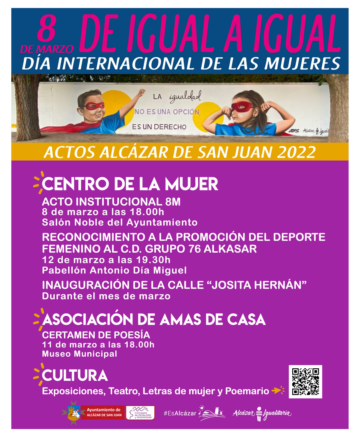 El Ayuntamiento de Alcázar de San Juan, a través de la concejalía de Igualdad, ha programado una serie de actividades que se desarrollarán durante todo el mes de marzo para conmemorar el Día Internacional de las Mujeres, que este año se celebra bajo el lema “De igual a igual”. Actividades de índole cultural, social e institucional para promover la igualdad de género y empoderar a las mujeres.